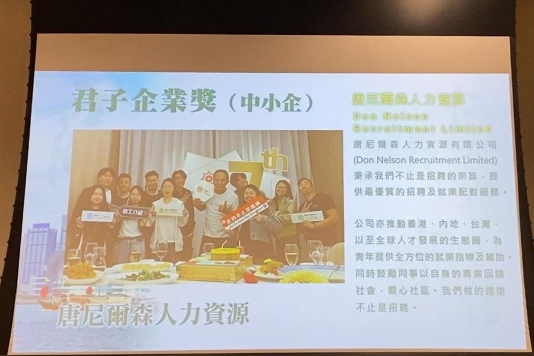 Don Nelson 香港連續兩年榮獲香港恒生大學「君子企業大獎中小企業獎」。我們公司秉承著「我們不止是招聘」的宗旨,提供最優質的招聘及就業配對服務。我們亦推動香港、內地、台灣,以至全球人才發展的生態圈,為青年提供全方位的就業指導及輔助。同時鼓勵同事以自身的專業回饋社會,關心社區。我們做的遠遠不止是招聘。